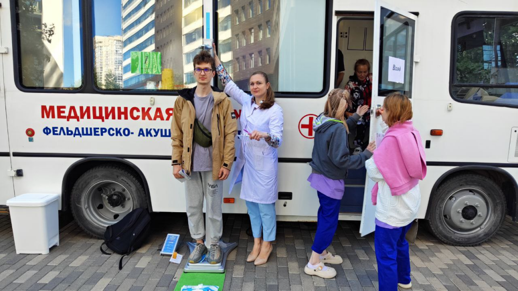 В передвижных фельдшерско-акушерских пунктах на территории фитнес-клуба специалисты Центральной городской клинической больницы №3 проводили флюорографию, забор крови для лабораторных исследований и консультации специалистов по вопросам репродуктивного здоровья.