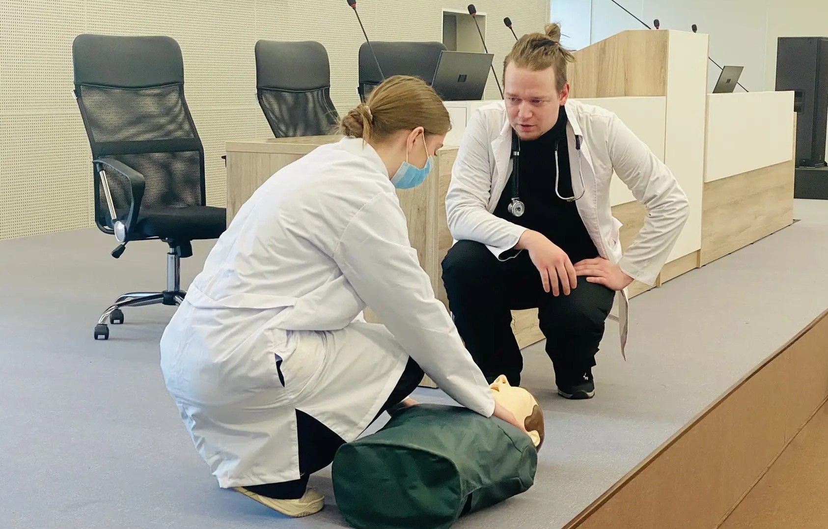 Фельдшеры отделения неотложной помощи продемонстрировали гостям приёмы сердечно-лёгочной реанимации, после чего ребята на специальном тренажёре смогли отработать полученные знания на практике.