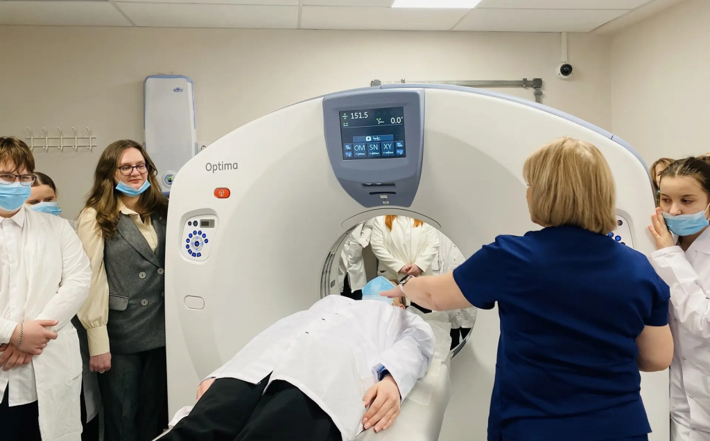 В отделении лучевой диагностики школьникам рассказали, какие исследования и для чего проводят на новейших цифровых рентгеновских аппаратах. Например, флюорография позволяет на ранних стадиях выявить рак лёгкого, а маммография — опухоли молочной железы. Денситометрия измеряет плотность костной ткани, определяет уровень содержания кальция в структуре костей и даёт оценку риска развития остеопороза, что особенно актуально для людей старшего поколения.