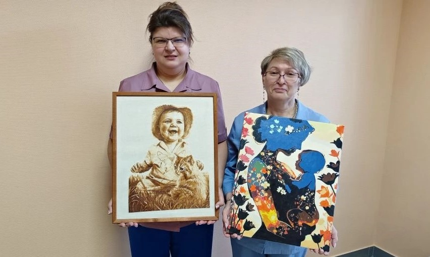 Это работы двух талантливых сотрудниц больницы. Одна из них — старшая акушерка Екатерина Бабушкина — виртуозно владеет техникой вышивки крестиком, её полотна по детализации напоминают живопись. Другая — акушерка доврачебного кабинета Лариса Журавлева — в свободное время берёт в руки кисти и пишет маслом, вышивает и плетёт изделия.