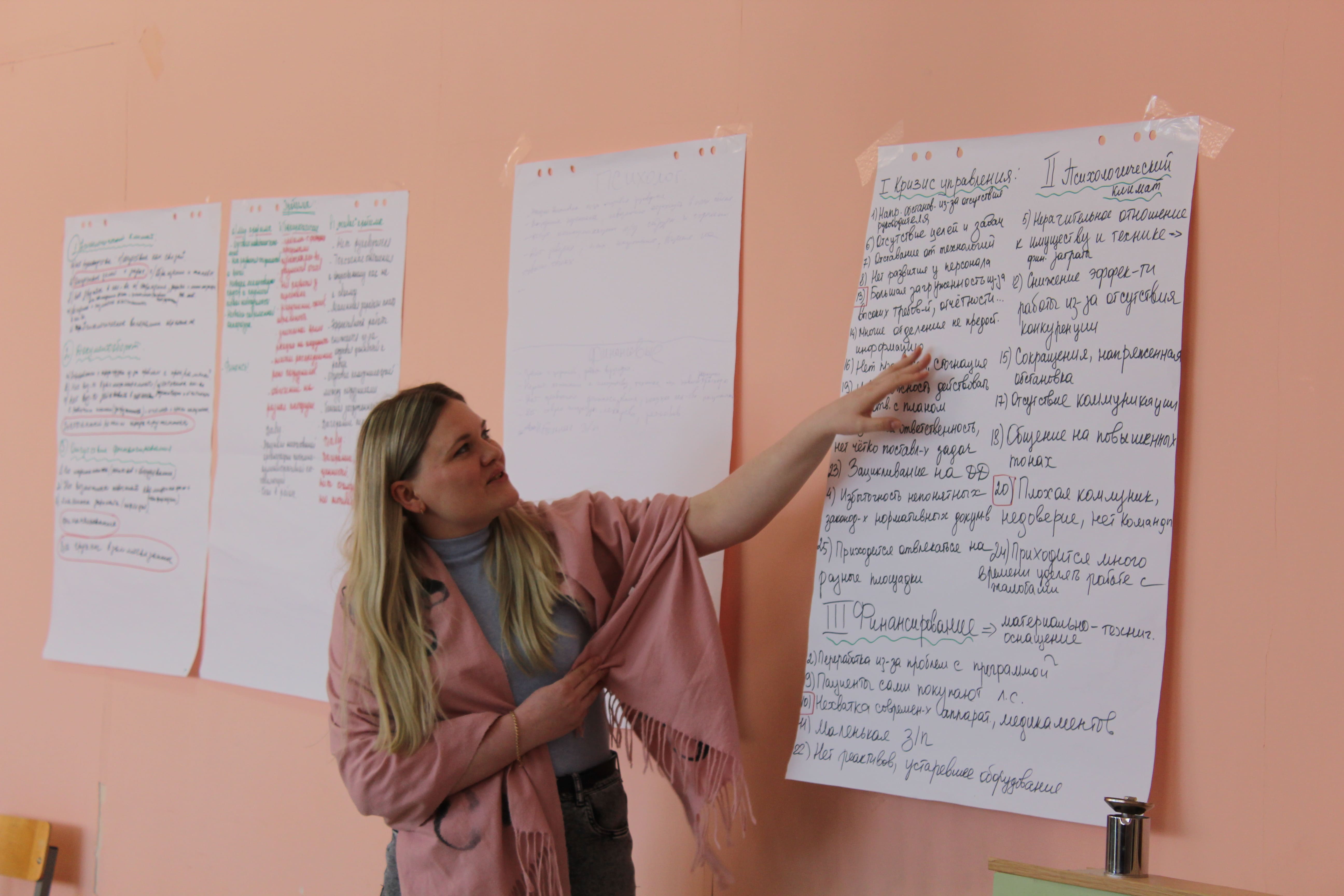 В тренинге участвовали 25 специалистов управленческого аппарата и 15 практикующих медиков. Работая в группах, они обсуждали текущую ситуацию в медорганизации, анализировали проблемные аспекты, порой спорили, и в этих дискуссиях прорисовывались основные «точки роста». В числе факторов, препятствующих развитию больницы, называли отсутствие взаимодействия и обмена информацией между коллегами, нехватку финансирования, несовершенство компьютерных программ, дефицит кадров, профессиональное выгорание, большое количество отчётов, недопонимание целей и задач, поставленных руководством.