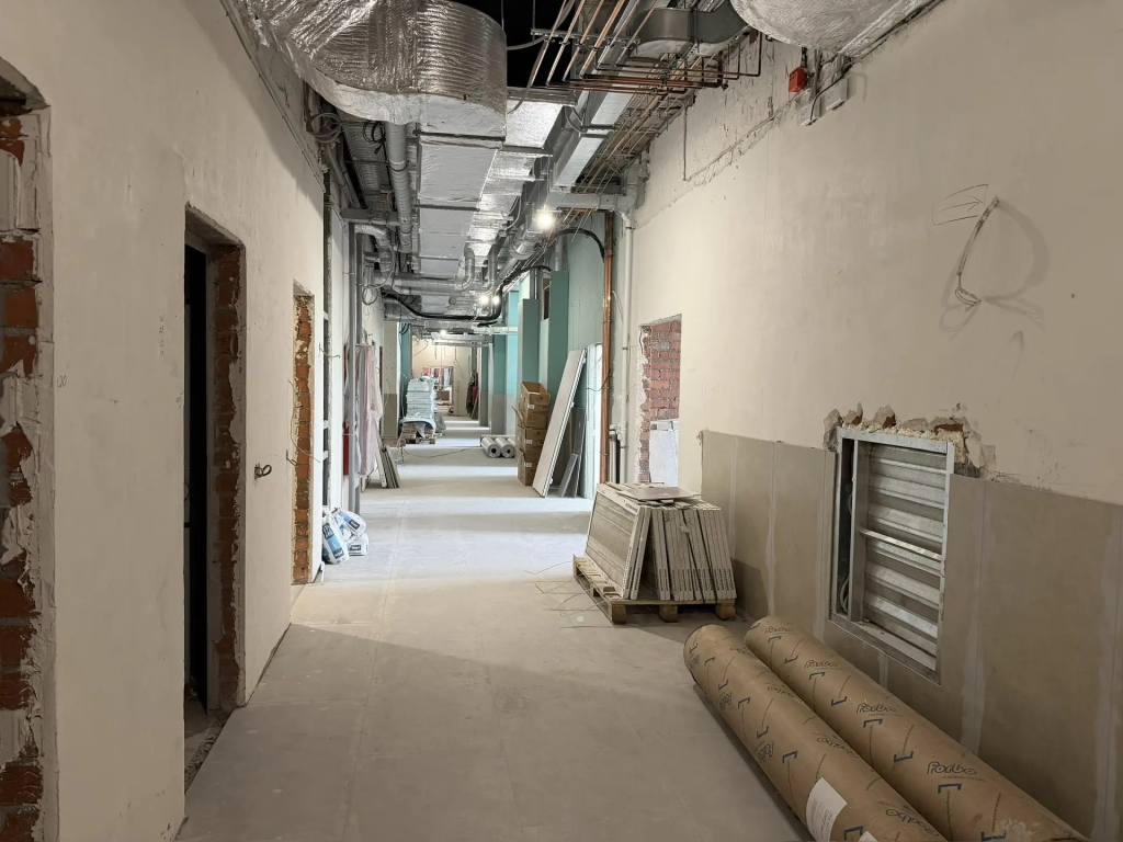 Завершается работа над окнами и витражами. Готовность фасада составляет 82%. Монтаж внутренних инженерных сетей также близок к завершению: водоснабжение и канализация готовы на 78%, отопление и вентиляция — на 86%.