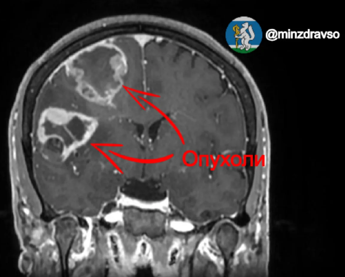 Заболевание заявило о себе в декабре прошлого года: тогда у 50-летней свердловчанки впервые случился эпилептический припадок. В ходе углублённой диагностики было выявлено три очага опухоли: два из них размером примерно 3х4 сантиметра находились в правой лобной доле, которая отвечает за движение. Третье новообразование размером около 7 миллиметров располагалось в левой доле, ответственной за речь, память и другие когнитивные навыки.