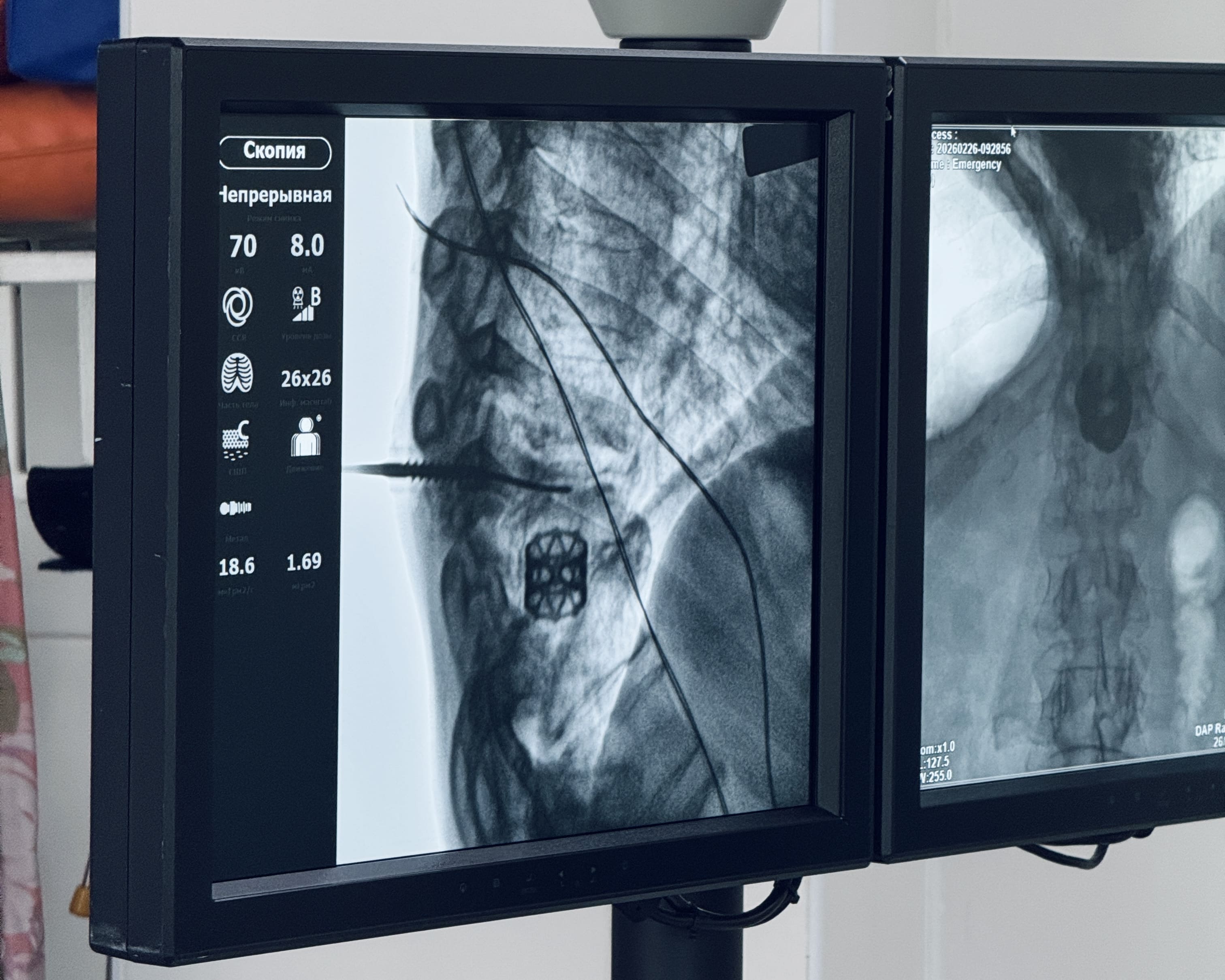 Обследование подтвердило воспалительное поражение межпозвонковых дисков, которое привело к нарушению оси позвоночника и его выраженной деформации. Ключевой задачей для нейрохирургов стал выбор метода, который одновременно обеспечил бы надёжную стабилизацию позвоночника и исключил риск распространения инфекции. Чтобы помочь пациенту, специалисты использовали отечественную систему: её полые внутри винты устанавливаются по тонкой направляющей спице, обеспечивая точность позиционирования имплантов и минимальное повреждение мягких тканей.