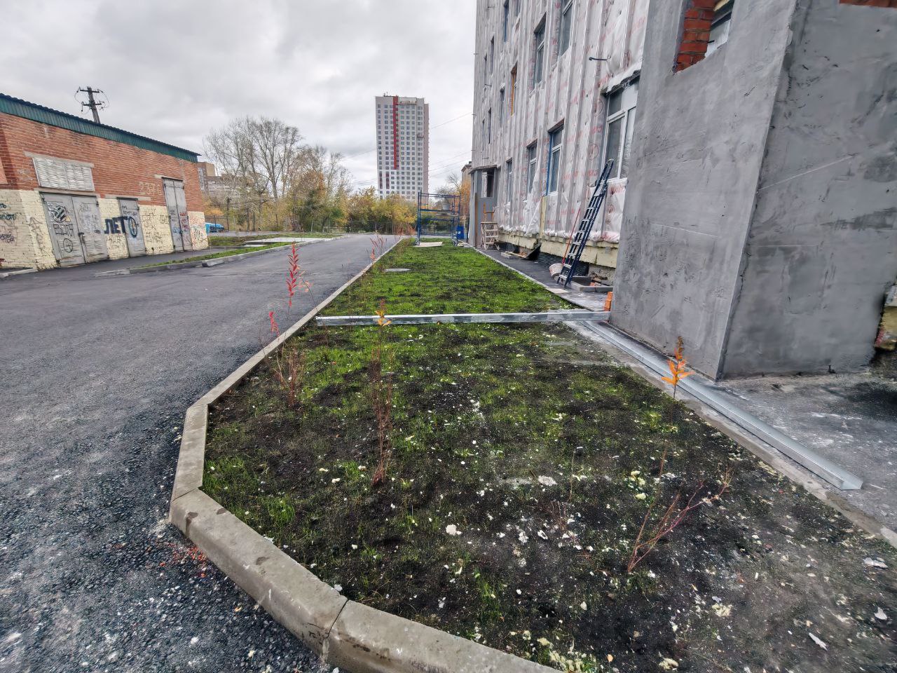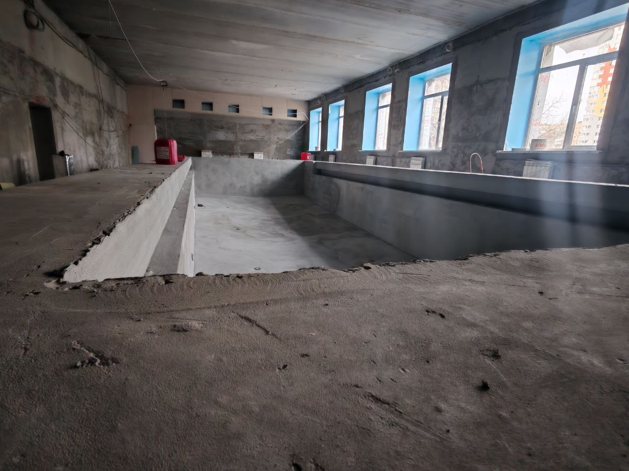Территорию вокруг здания, включая тротуары и площадку перед входной группой, уже покрыли асфальтом, оформили газоны, высадили кустарники, вдоль периметра установили ограждение. Организована рекреационная зона, вывезен строительный мусор. В специализированных помещениях, таких как процедурные, прививочные кабинеты, санузлы, стены облицованы плиткой. В бассейнах проведена финальная подготовка поверхности, выполнена гидроизоляция для последующей укладки плитки.