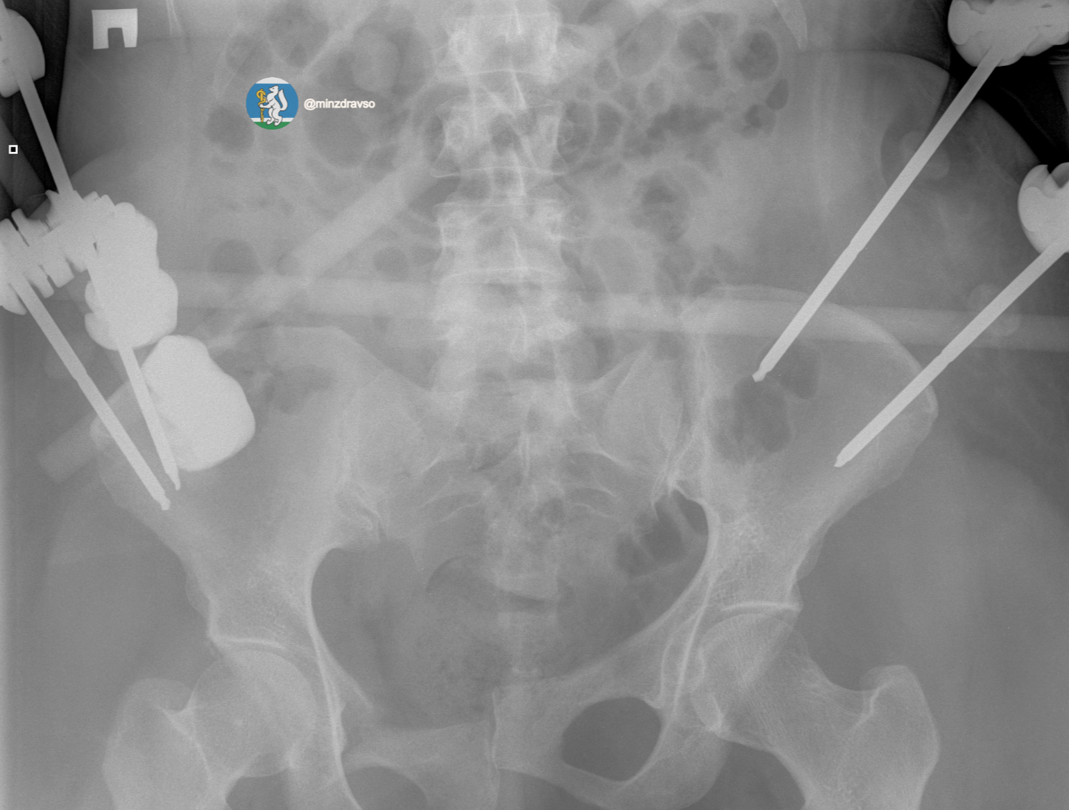 В течение первых 15 минут были проведены все необходимые исследования. Врачи диагностировали тяжелую политравму, включающую закрытую черепно-мозговую травму, ушиб головного мозга, повреждение челюстно-лицевых костей, ребер, двусторонний пневмоторакс, оскольчатый перелом правой ключицы и раздробленные кости таза. Крайне тяжелое повреждение таза представляло высокий риск массивной кровопотери, поэтому борьба за жизнь пациентки началась с немедленной стабилизации ее состояния.