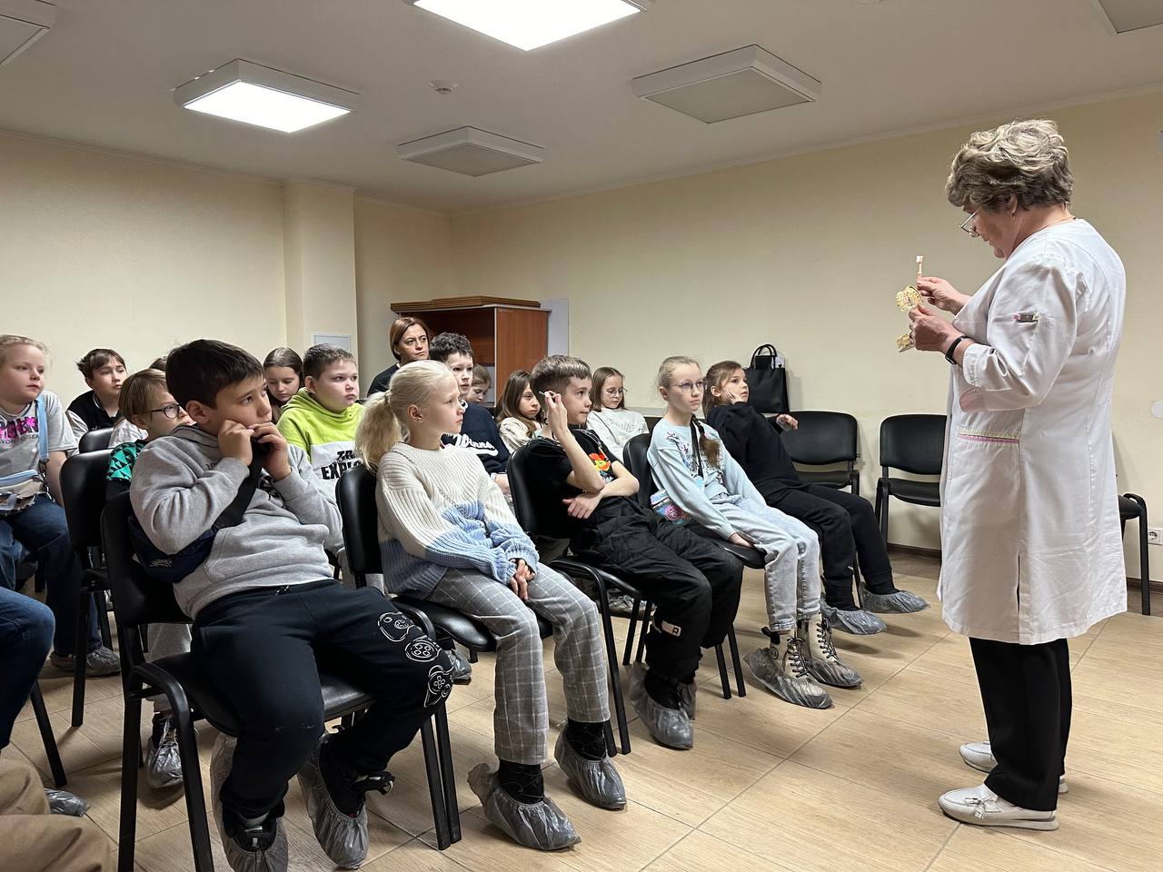 В лечебном кабинете детского отделения доктор показал посетителям стоматологическую установку, на гипсовых моделях челюстей наглядно продемонстрировал процесс препарирования кариозных полостей. Каждый ребёнок с помощью медсестры мог замешать цветную пломбу и запломбировать ею гипсовый зуб. В игровой форме гостям рассказали об анатомии зубов, гигиене полости рта и правильном питании, технике чистки зубов. В конференц-зале поликлиники знания помог закрепить тематический мультфильм, а в конце визита каждый ребёнок получил в подарок «кристалл смелости» и зубную пасту.
