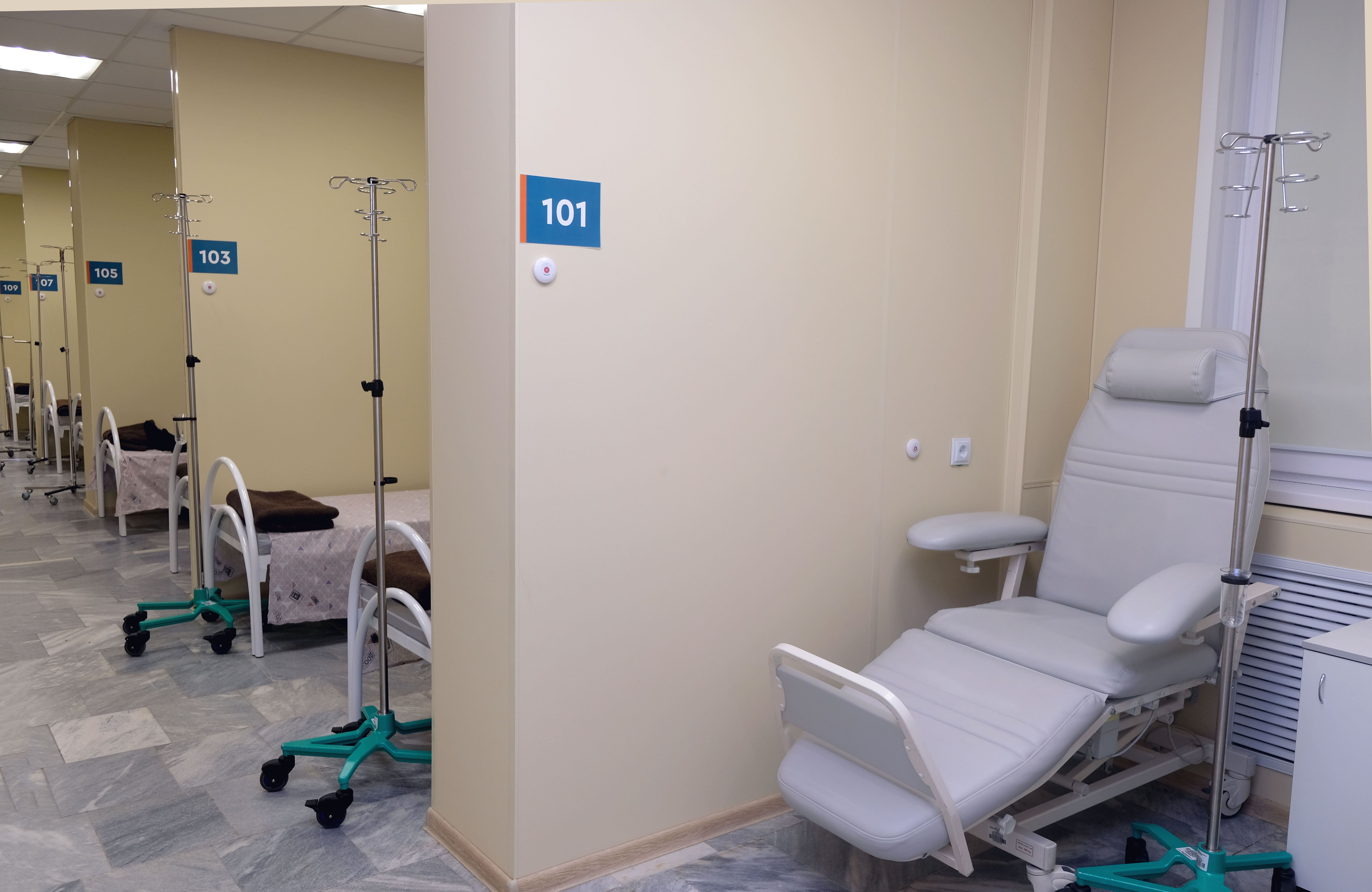 В большом зале предусмотрены уютные индивидуальные боксы, оборудованные новой мебелью (креслами, кроватями, тумбочками) и кнопкой вызова персонала. После её нажатия медицинская сестра приходит на помощь через несколько секунд.