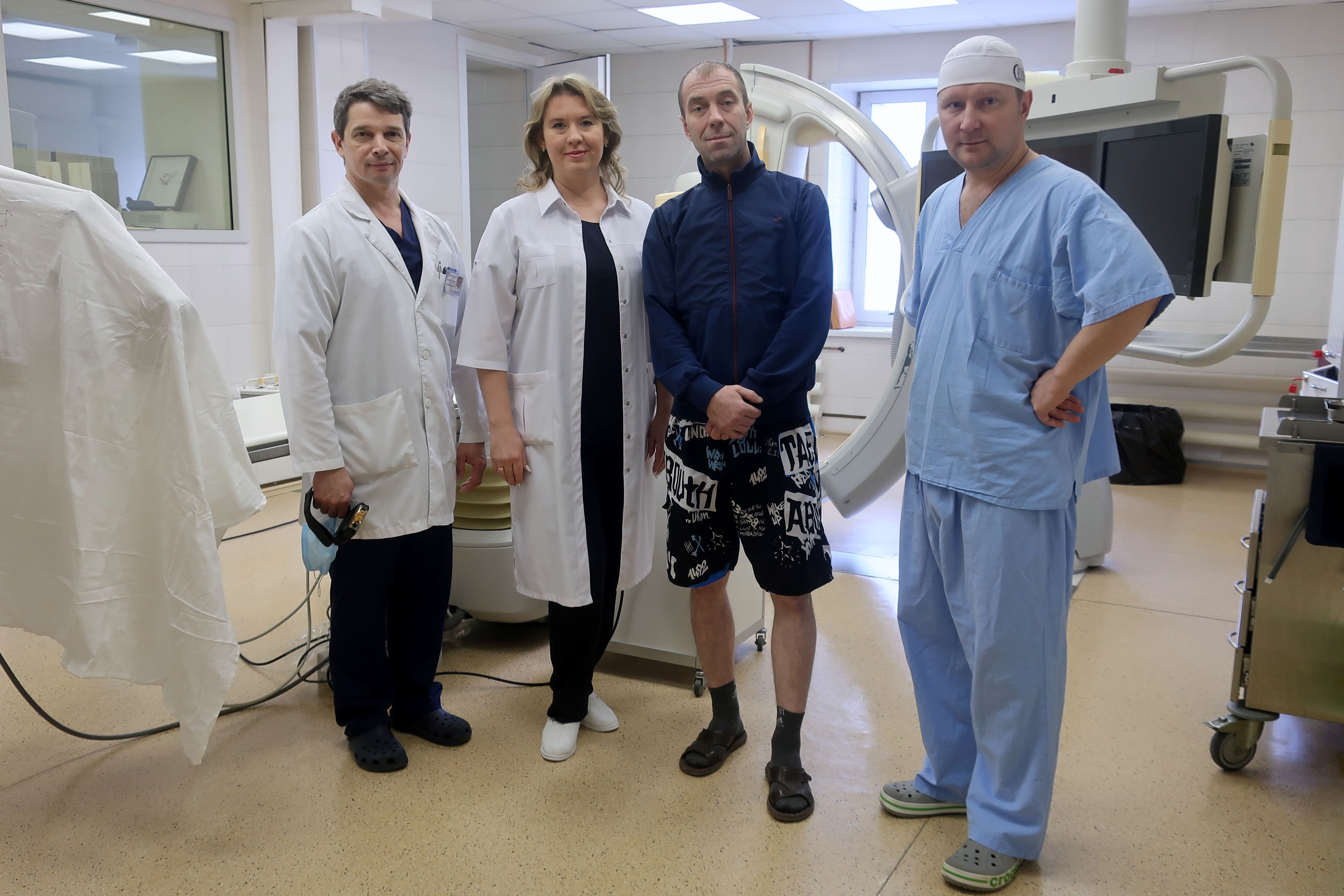 «В такой ситуации всё нужно делать быстро и чётко, права на ошибку нет. Нужно с первого раза пройти проводником сквозь окклюзию в истинный просвет артерии, не повредив стенку сосуда. И делать это приходится практически вслепую, потому что контраст не проходит дальше», — отметил врач отделения рентгенохирургических методов диагностики и лечения СОКБ №1 Вадим Бебнев, которому в ходе вмешательства помогала операционная медсестра Зиля Галимова.