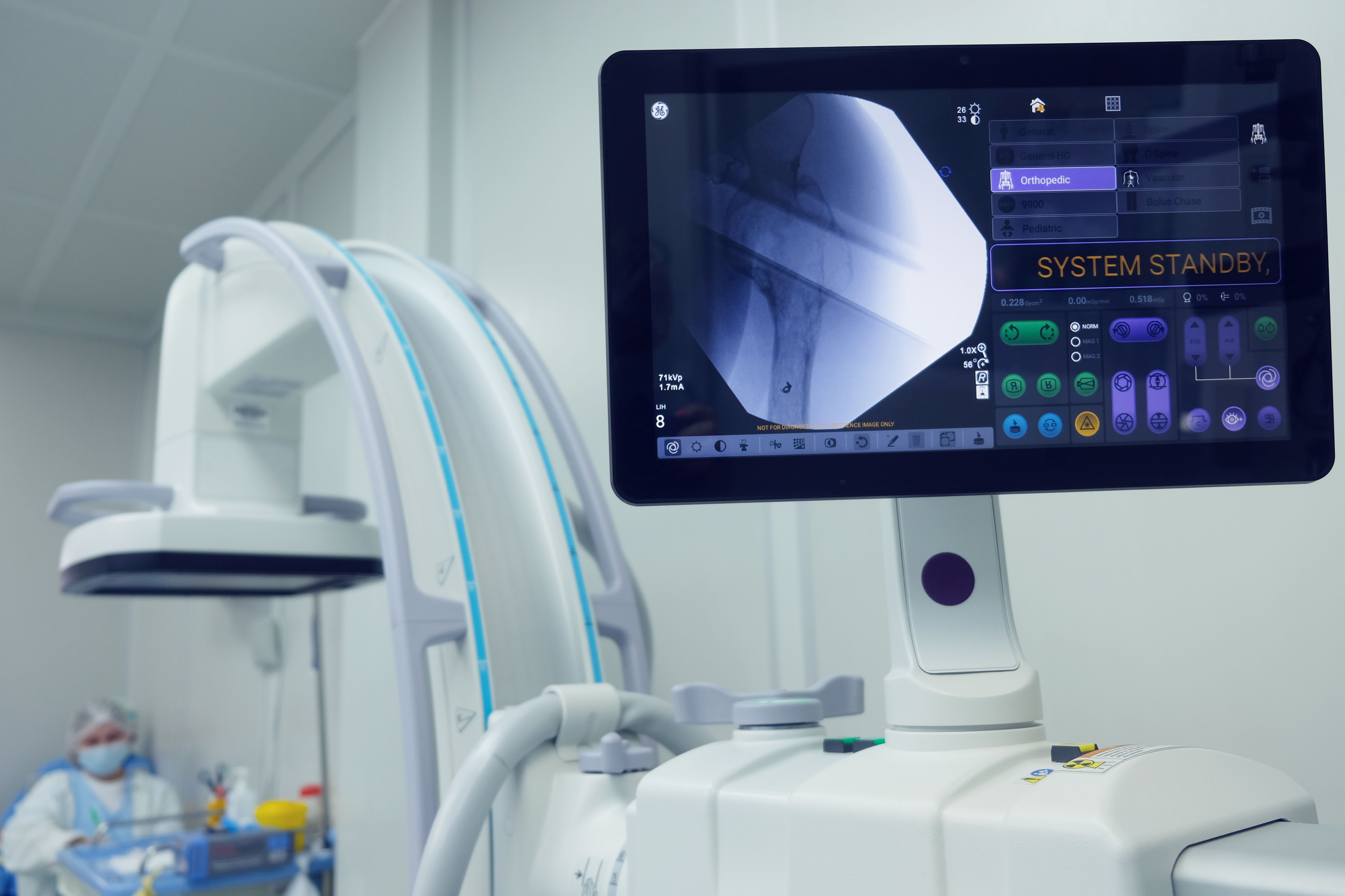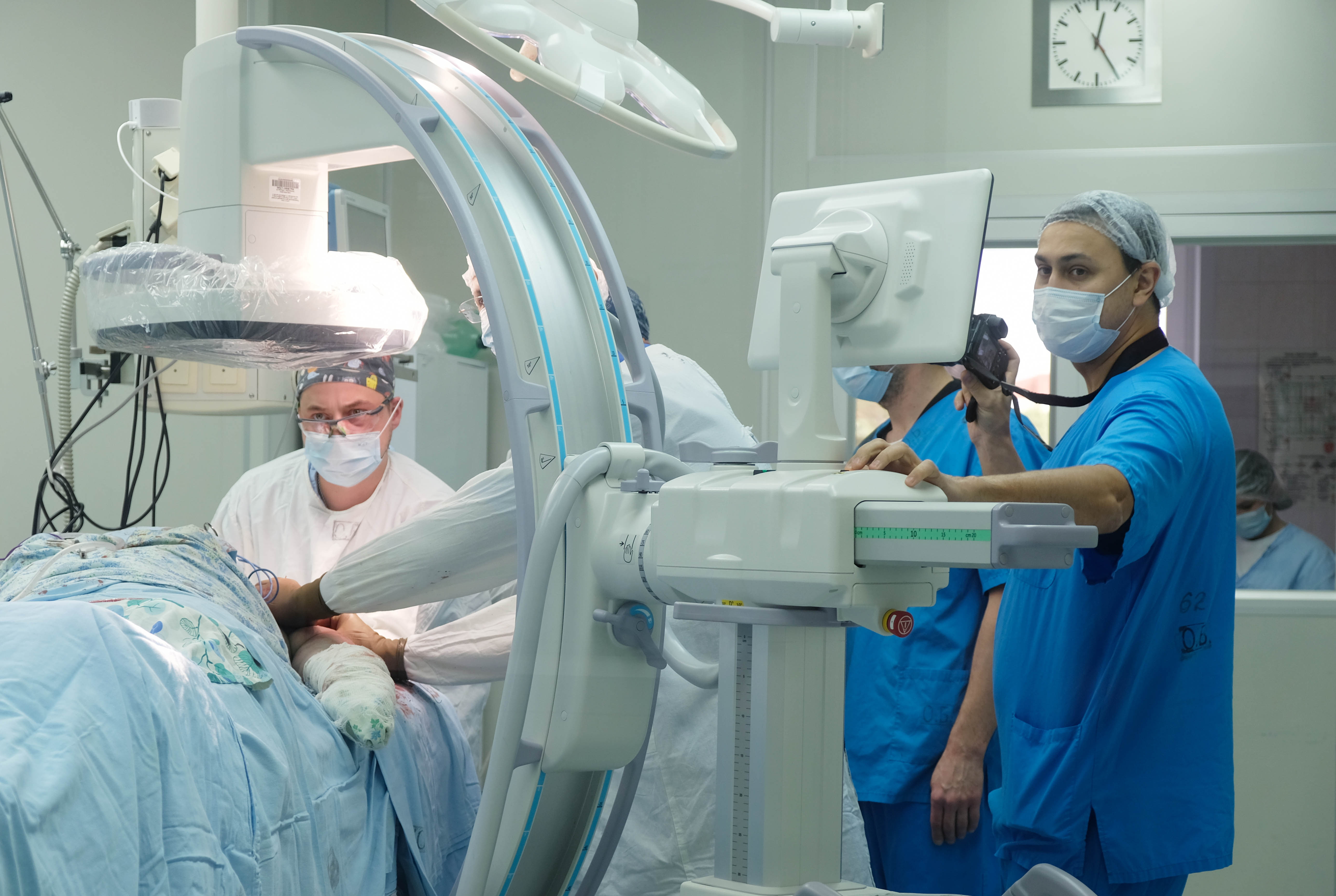 Как только «искусственную кость» доставили в СООД, была назначена дата хирургического вмешательства. Стоит отметить, что костные метастазы от опухоли почки характеризуются интенсивным прорастанием в сосудистую сеть, поэтому врачам пришлось принять меры для снижения риска массированного кровотечения. На первом этапе в отделении рентгенохирургических методов диагностики и лечения пациенту выполнили эмболизацию сосудов, питающих опухоль, снизив риск кровопотери, а через неделю установили имплант.